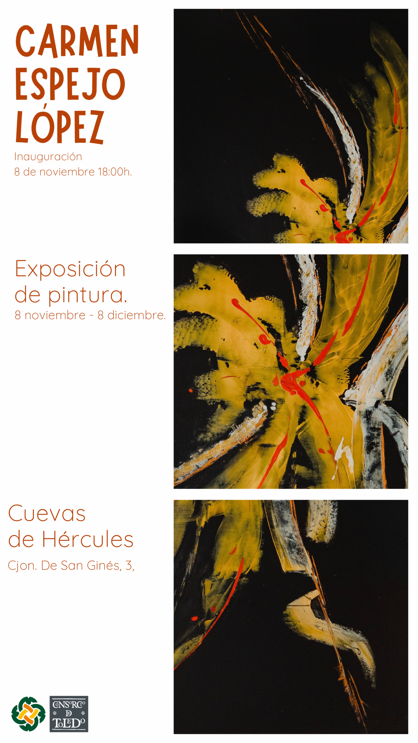 Carmen Espejo López, exposición de pintura La exposición es de una pintora granadina afincada en Toledo, de profesión peluquera que durante la pandemia descubrió su interés por la pintura. Utiliza materiales reciclados, desde los lienzos hasta los materiales con los que crea texturas
