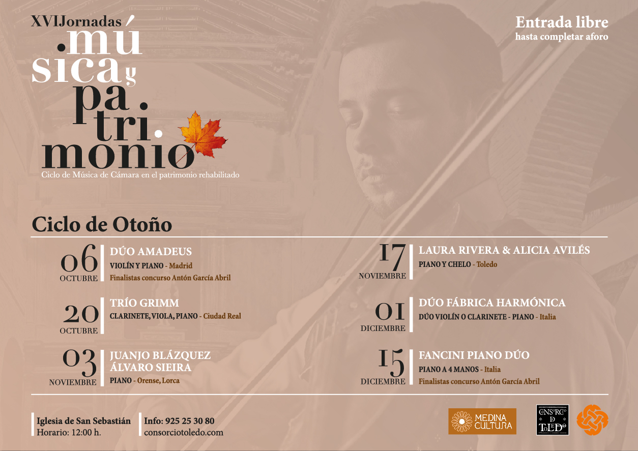 El ciclo, enmarcado en las XVI Jornadas de Música y Patrimonio, dará comienzo este domingo 6 de octubre a las 12:00 horas en la iglesia de San Sebastián, un espacio emblemático que ha sido rehabilitado por el Consorcio de Toledo para el disfrute de la ciudadanía. El concierto inaugural estará a cargo del Dúo Amadeus (violín y piano), finalistas del concurso Antón García Abril.