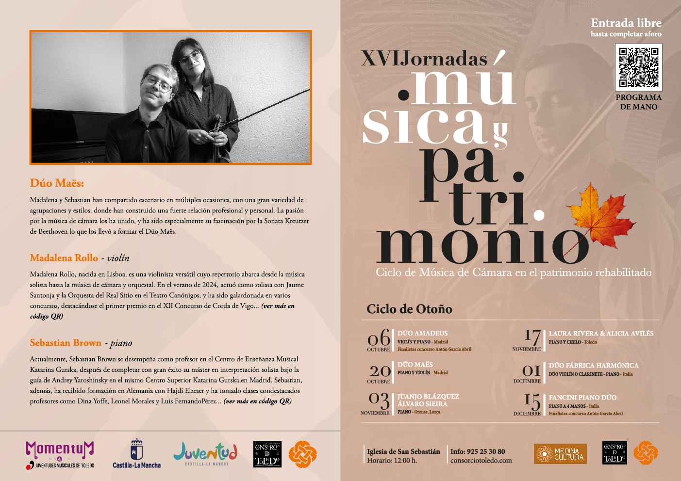 Por otro lado, este domingo, 20 de octubre, el escenario será la Iglesia de San Sebastián, que acogerá a las 12:00 horas un concierto del Dúo Maës, compuesto por la violinista Madalena Rollo y el pianista Sebastian Brown, dentro del Ciclo de Música en Cámara en el patrimonio rehabiltado. En esta ocasión, los artistas interpretarán un programa de música de cámara, destacando la Sonata para violín y piano No. 9 “Kreuzer” de Ludwig van Beethoven.