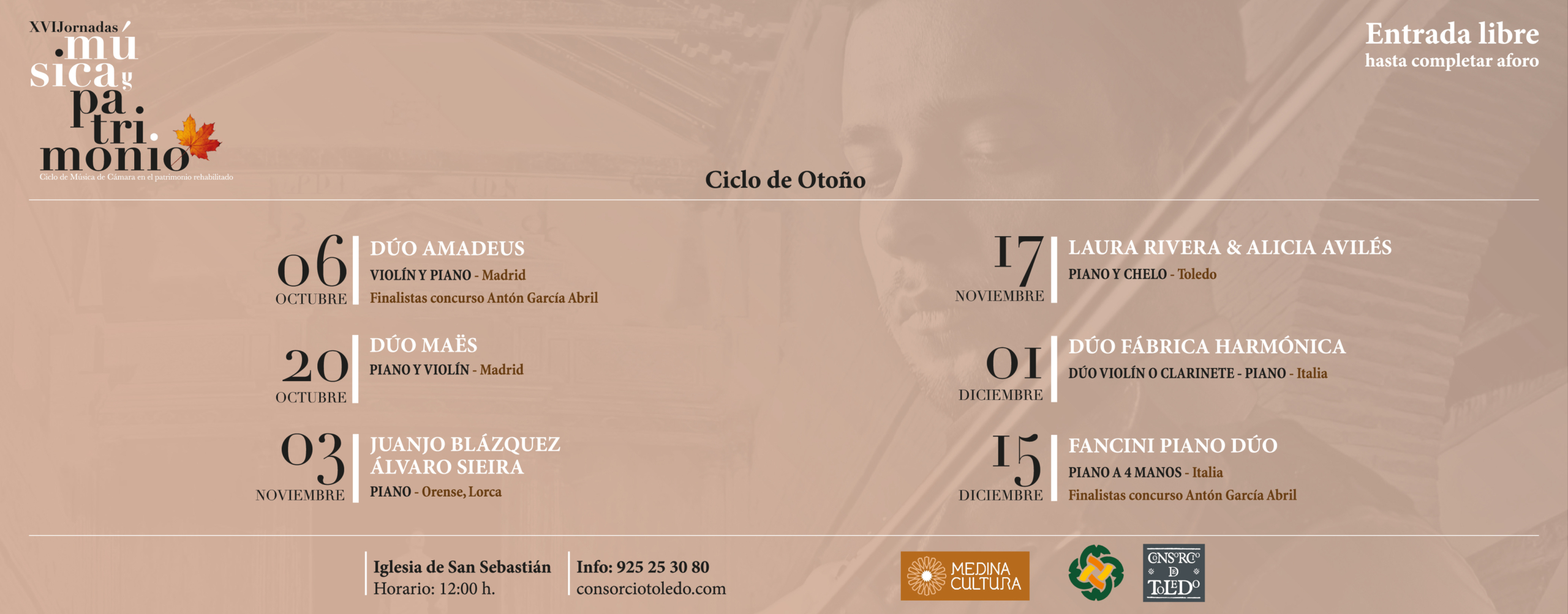 Este Ciclo de Otoño, que se extenderá hasta el mes de diciembre, continuará con su programación el 3 de noviembre con el recital de los pianistas Juanjo Blázquez y Álvaro Sieira, el 17 de noviembre con el dúo toledano formado por Laura Rivera (piano) y Alicia Avilés (chelo), el 1 de diciembre con el Dúo Fábrica Harmónica italiano (dúo violín o clarinete – piano) y el 15 de diciembre concluirá con la actuación de Fancini Piano Dúo, integrado por los hermanos Ella y Betsabea Fancini.