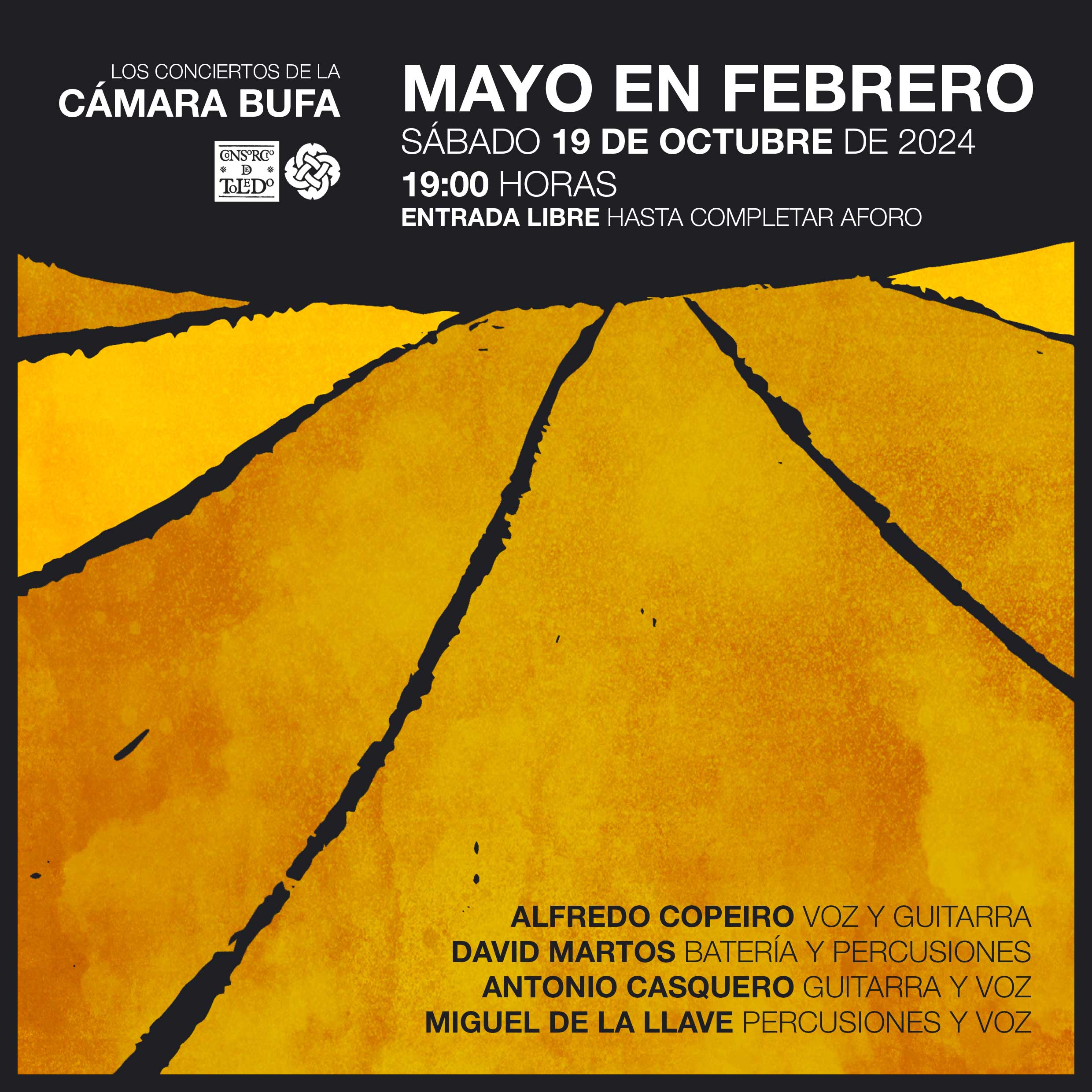 El sábado 19 de octubre a las 19:00 horas, la Cámara Bufa será escenario de un concierto enmarcado dentro de su propio ciclo de actuaciones con la participación del grupo toledano “Mayo en febrero”, que presentará su nuevo single “Vida y Pan”, dentro de un repertorio influenciado por el folk y el rock de los años 90. La banda, compuesta por Alfredo Copeiro (voz y guitarra), David Martos (batería y percusiones), Antonio Casquero (guitarra y voz) y Miguel de la Llave (percusión), ofrecerá un espectáculo íntimo y cautivador en este espacio tan peculiar. La entrada será libre hasta completar aforo.